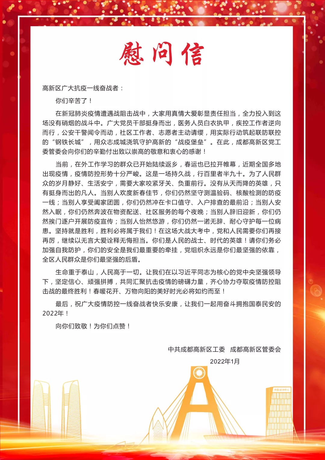在新冠肺炎疫情遭遇战阻击战中,大家用真情大爱彰显责任担当,全力投入到这场没有硝烟的战斗中。广大党员干部挺身而出,医务人员白衣执甲,疾控工作者逆向而行,公安干警闻令而动,社区工作者、志愿者主动请缨,用实际行动筑起联防联控的“钢铁长城”,用众志成城浇筑守护高新的“战疫堡垒”。在此,成都高新区党工委管委会向你们的辛勤付出致以崇高的敬意和衷心的感谢!浏览 : 5439分享