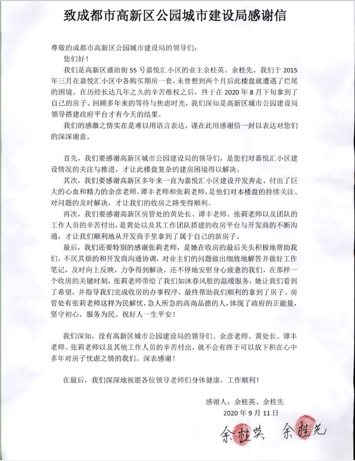 近日,由成都倍特建筑安装工程有限公司承建的嘉悦汇A标段,历经多方努力,已基本完成了小业主的交付工作。2020年9月11日,高新发展法务部借调到公园局的张莉同志收到来自嘉悦汇小业主余桂先、余桂英两位女士赠送的绣有“为民解忧、尽职尽责”、“思民生、解民难、做实事、暖民心”的锦旗及表扬信。两位业主对张莉同志所提供的服务给与了高度的赞扬和诚挚的感谢。浏览 : 12658分享